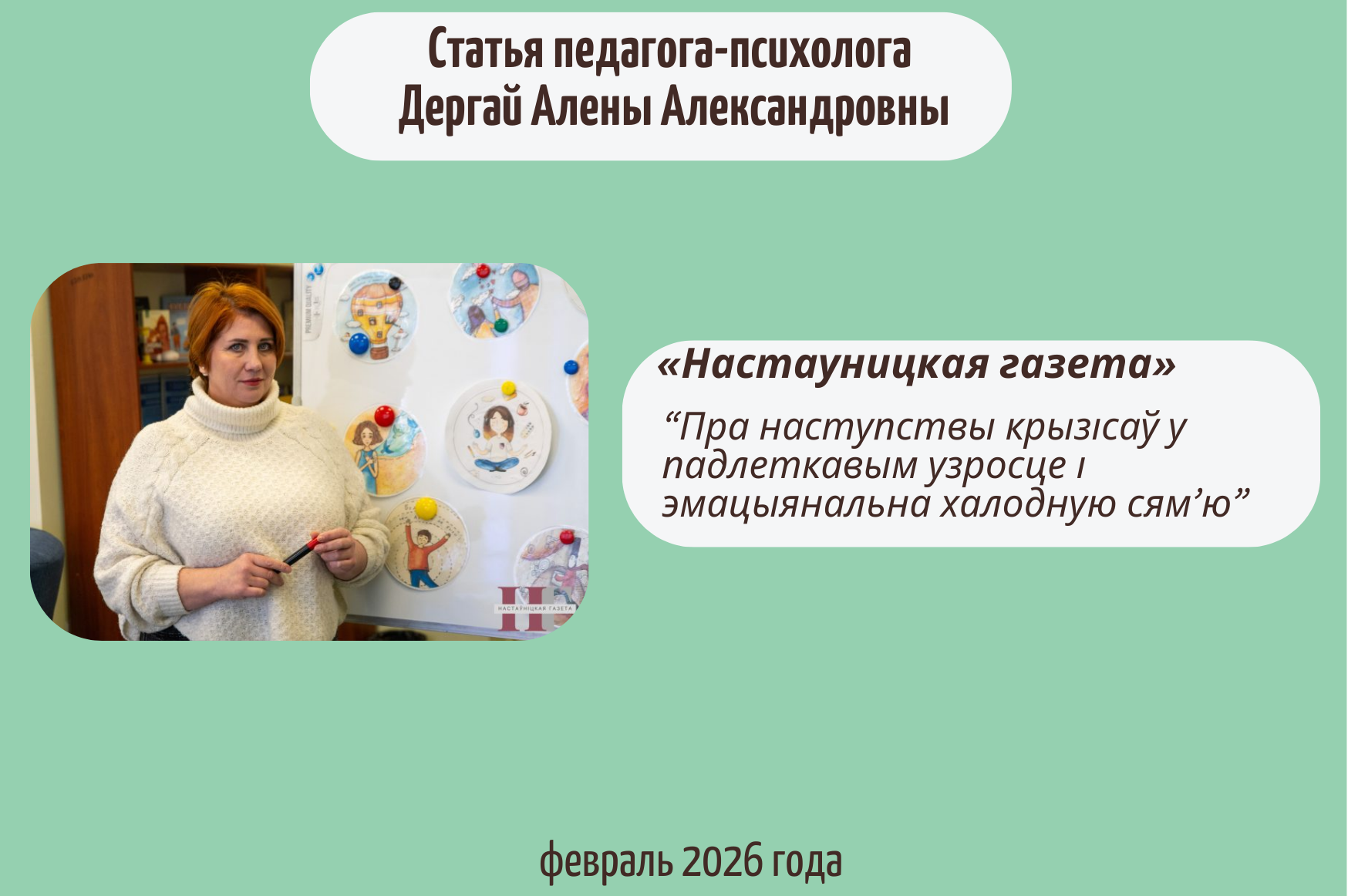 В феврале 2026 года в «Настаўніцкай газете» вышла статья педагога-психолога информационно-методического отдела Республиканского центра психологической помощи Института психологии БГПУ Алены (читать дальше)