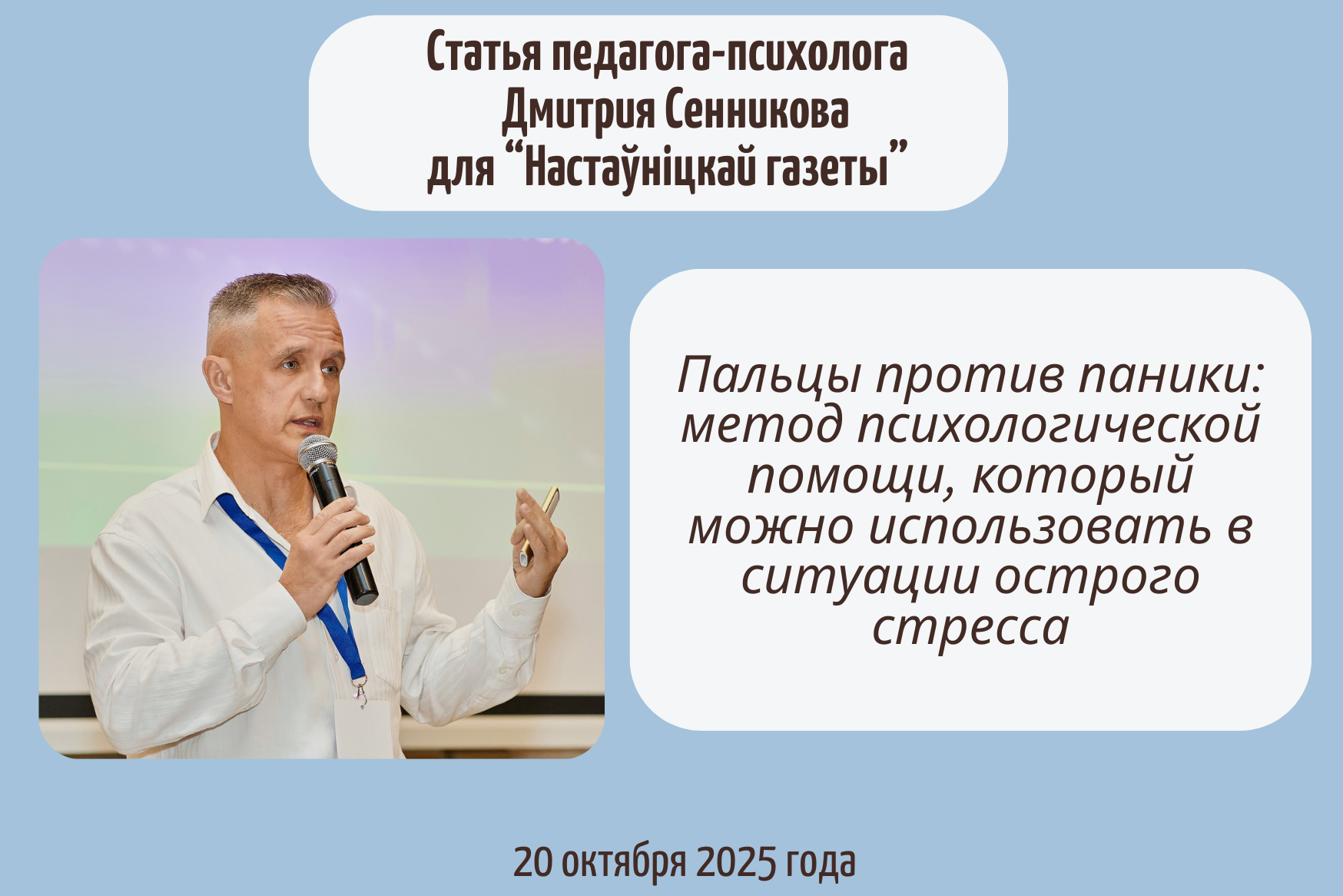 Педагог-психолог отдела психологической помощи в кризисных ситуациях Республиканского центра психологической помощи Института психологии БГПУ Дмитрий Сенников опубликовал статью в издании «Настаўніцкая газета». (читать дальше)